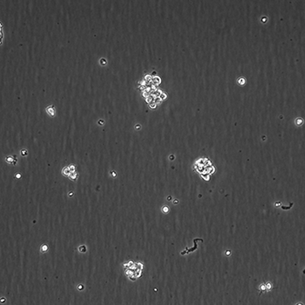 將含有1mL細胞懸液的凍存管在37℃水浴中迅速搖晃解凍,加入4mL培養基混合均勻。在1000RPM條件下離心4分鐘,棄去上清液,補加1-2mL培養基后吹勻。然后將所有細胞懸液加入培養瓶中培養過夜(或將細胞懸液加入10cm皿中,加入約8ml培養基,培養過夜)。第二天換液并檢查細胞密度。 |